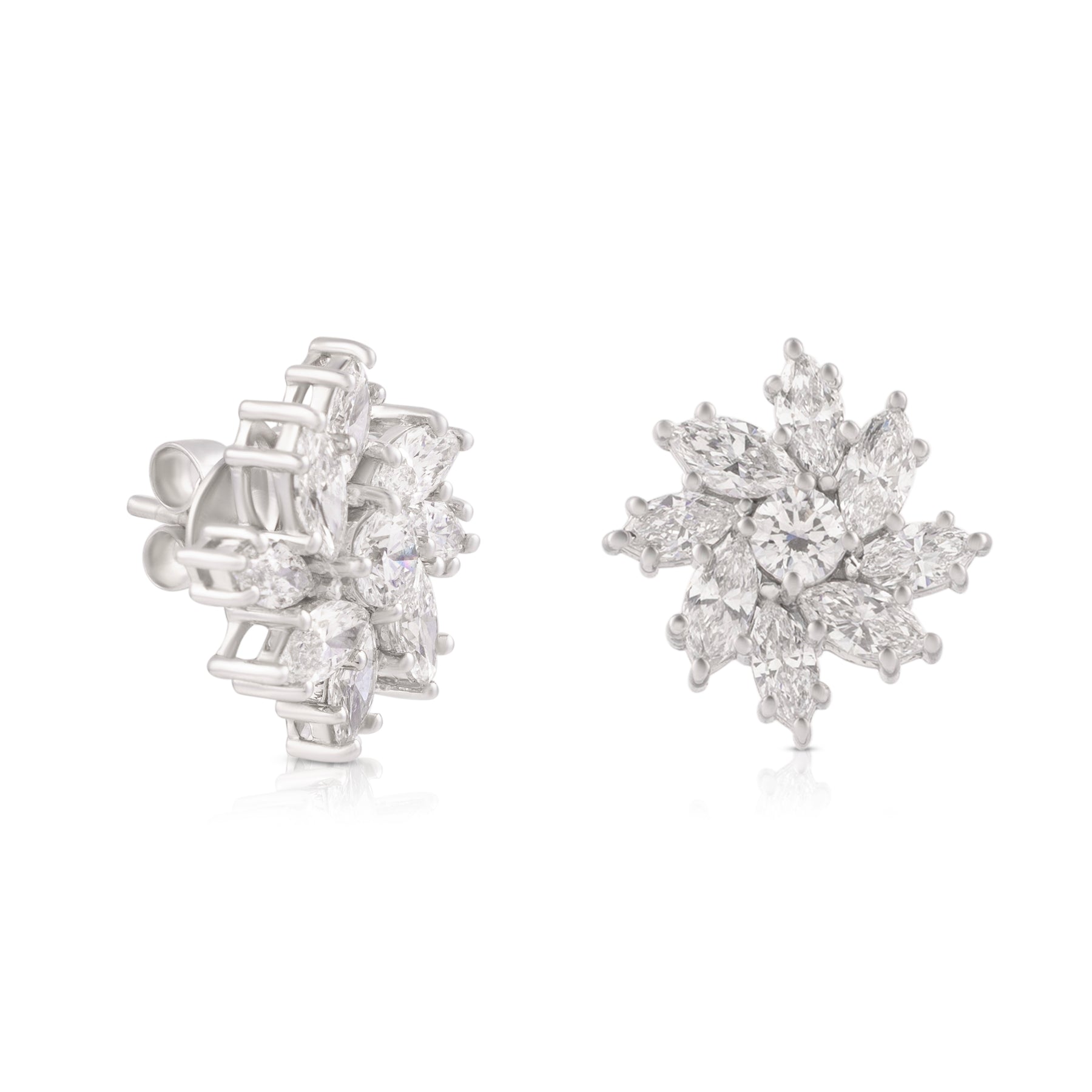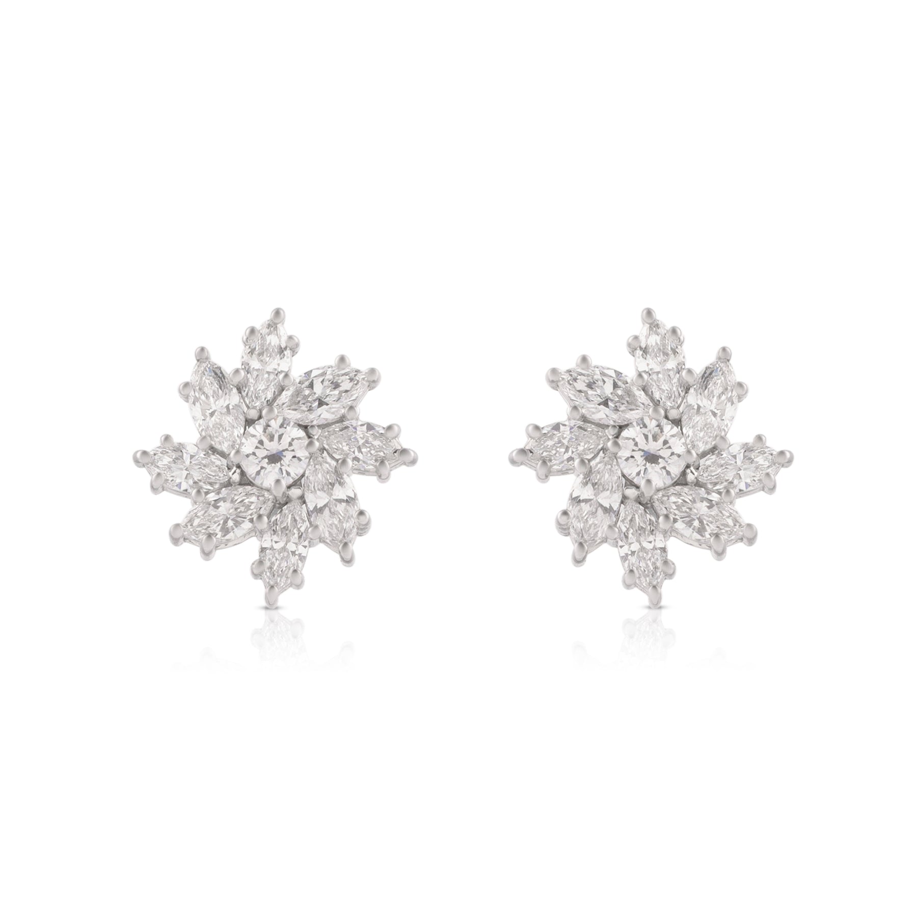 These earrings are a stunning tribute to the Dahlia, capturing the flower's intricate, multi-layered geometry in a sophisticated, icy palette. They balance the organic beauty of nature with the sharp precision of fine jewelry.